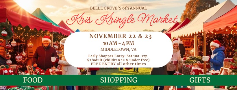 Belle Grove will host the sixth annual Kris Kringle Market on Saturday, November 22 and Sunday, November 23, 10 a.m.-4 p.m. each day. In recent years it has attracted close to 5,000 attendees, making it the perfect way to market your business to discerning consumers.